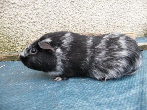Cavia pezzata in cui su base bianca sono presenti delle pezzature di limitata estensione nella parte superiore della testa, del collo e del dorso.
