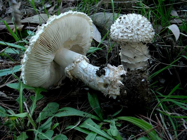 Cappello: 5-15 cm, prima globoso, poi spianato, con margine eccedente le lamelle, con verruche più depresse verso il margine, biancastro rosa pallido.