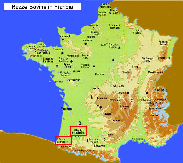 Zone di allevamento della razza Blonde d'Aquitaine (Garonnese) in Francia