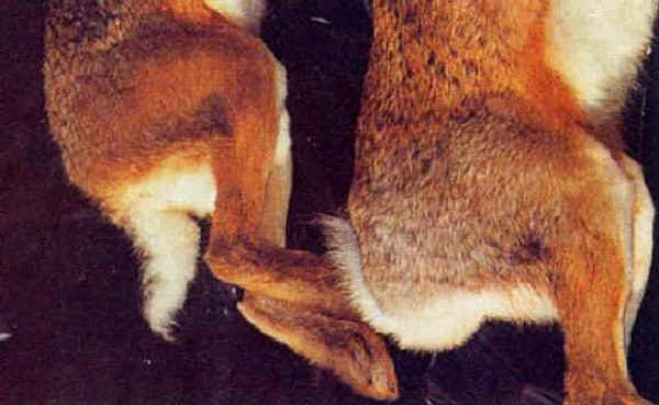 Particolare della coscia nelle lepre italica (sinistra) e nella lepre europea (destra) Particolare della coscia nelle lepre italica (sinistra) e nella lepre europea (destra)